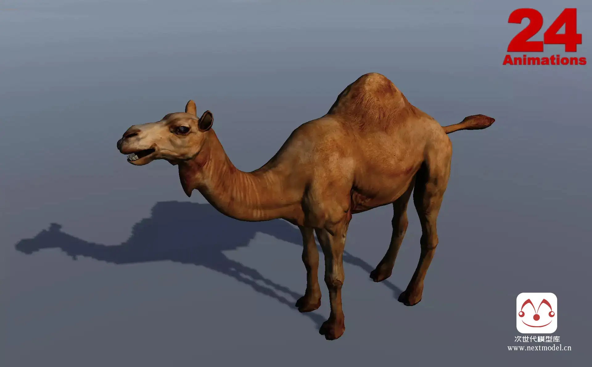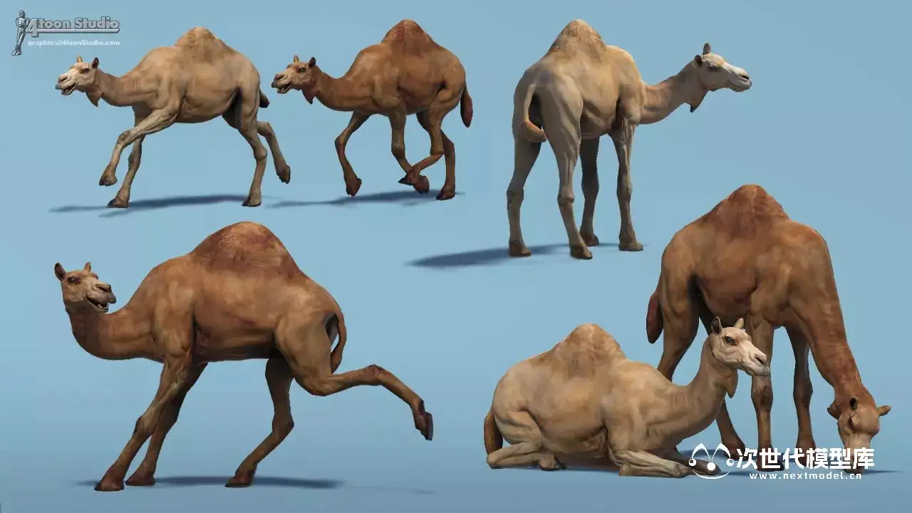 非洲野生动物单峰骆驼3d模型,包括其模型、纹理以及动画。骆驼是一种有19种不同纹理的动物,每种纹理都有两种变体。同时,骆驼模型配备了18个独特的动画,包括行走、奔跑、空闲、躺下、休息躺着、站起来、进食开始/进食/结束、战斗空闲、击右/左/前/后、攻击咬/头/腿、死亡、左/右转、转身走/跑、向后走等。