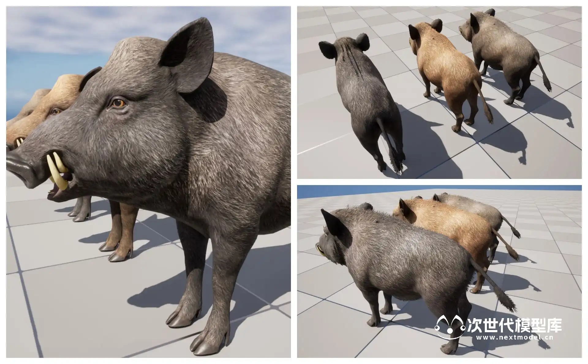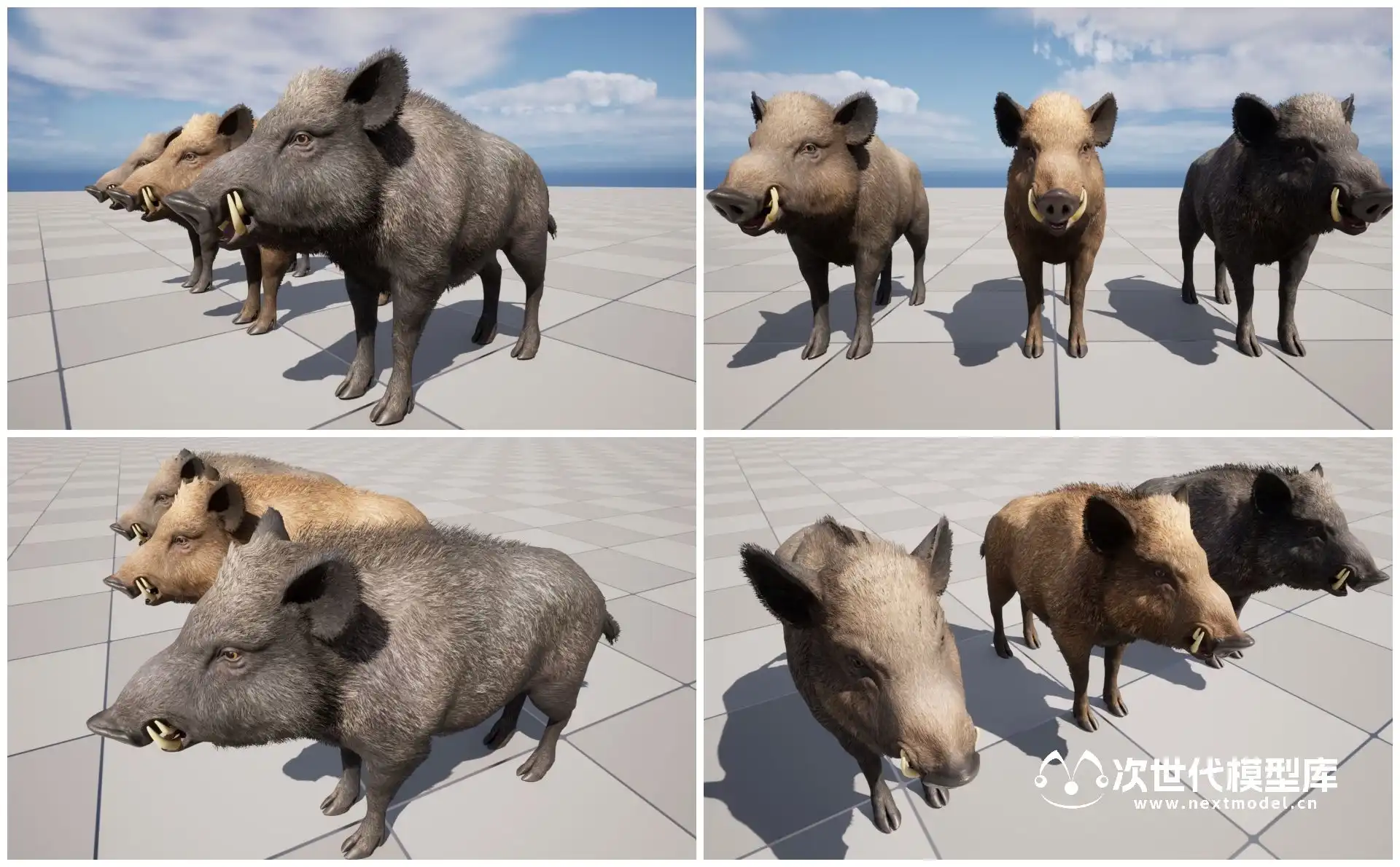 AAA级品质写实野生动物-雄性野猪3d模型,模型拥有超过70个以上的动画,3中不同外观的皮肤。纹理贴图拥有Texture maps (three color variations) - albedo (alpha mask), AO / metallic / roughness, normal map 贴图尺寸均为4096x4096。