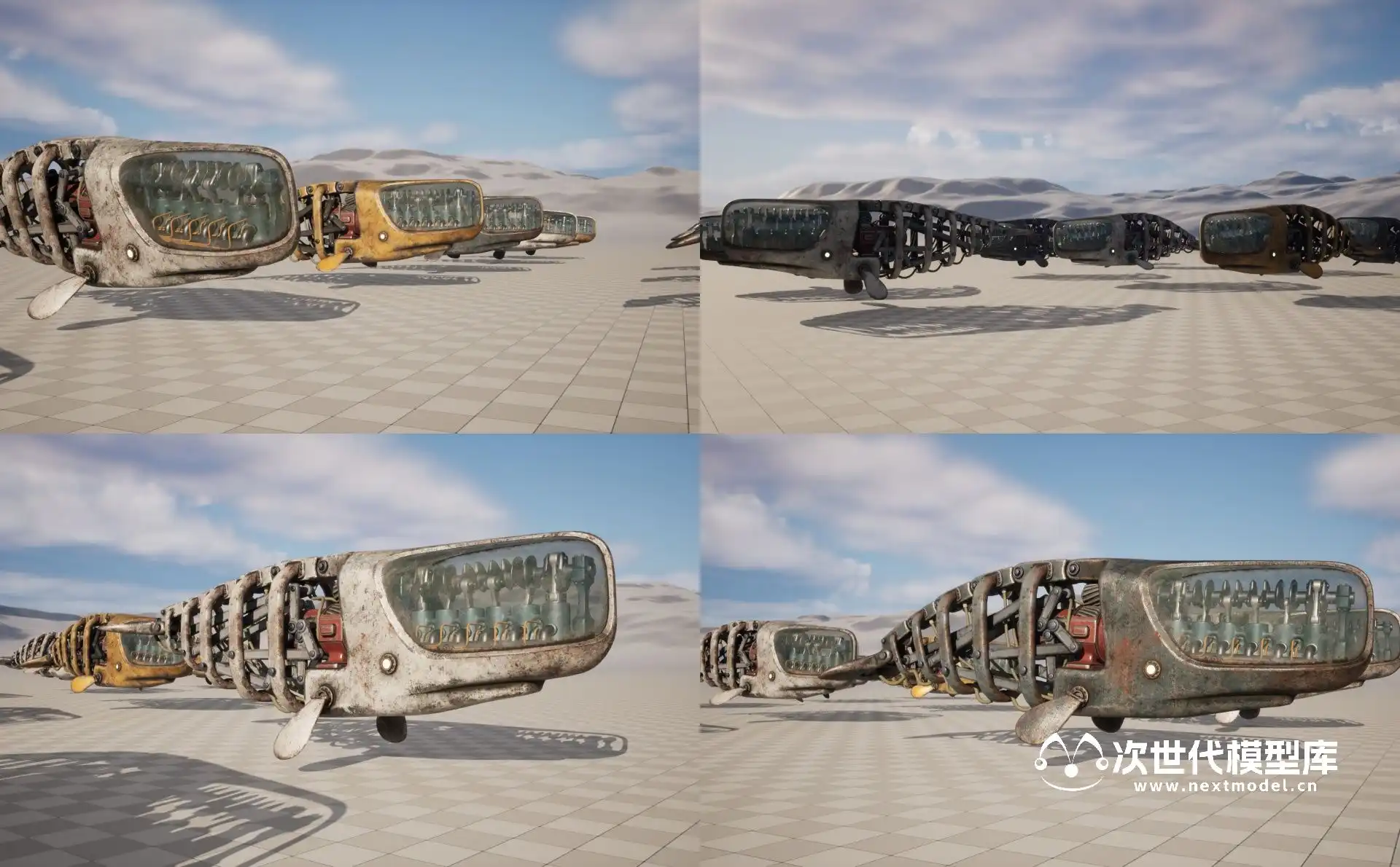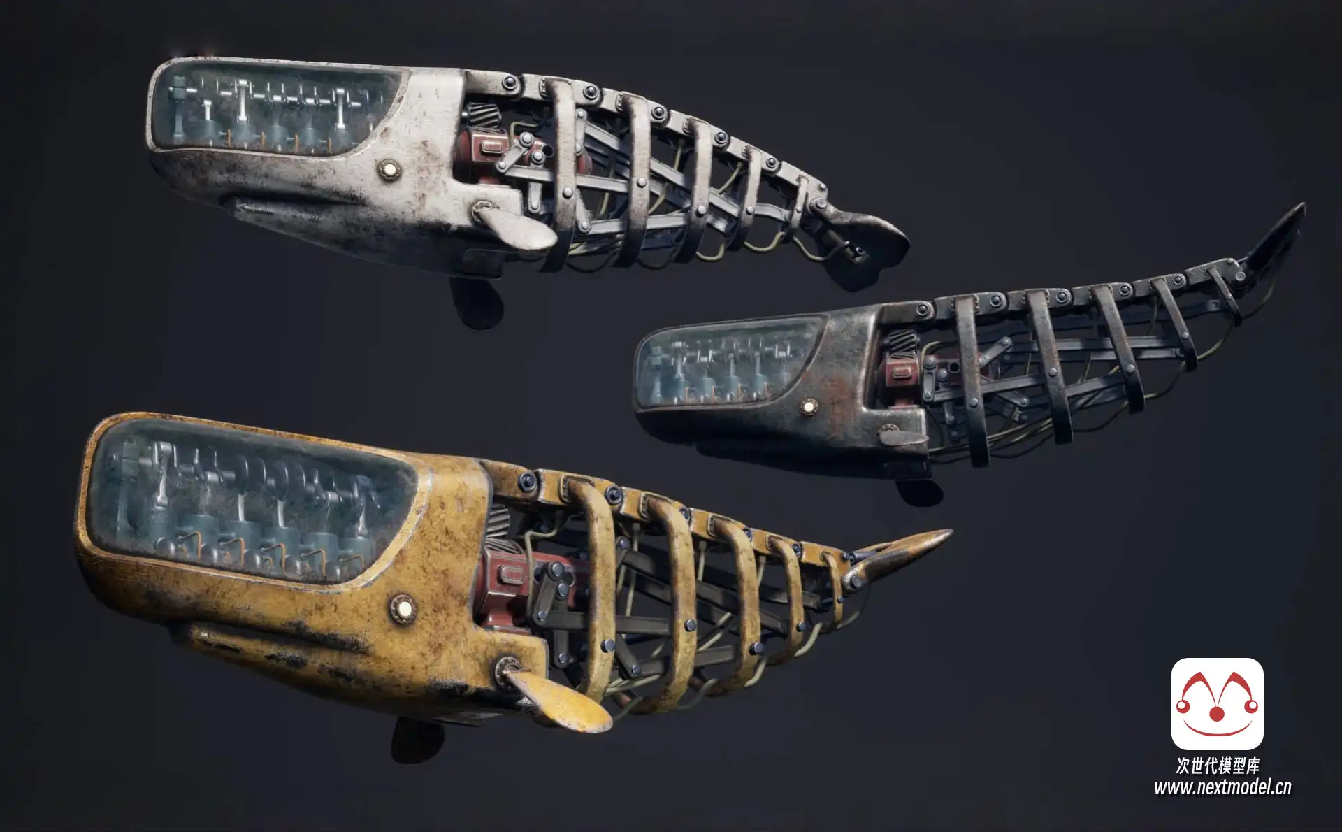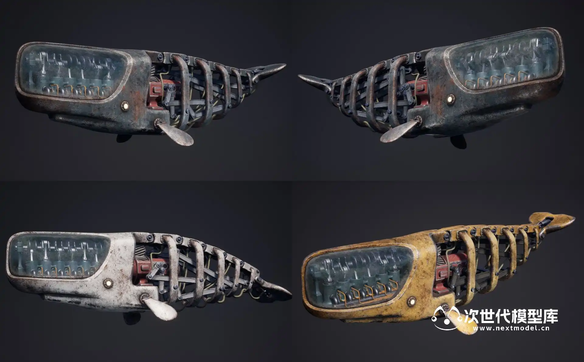 Whale submarine是一个拥有史诗级动画的深海巨兽机械鲸鱼潜艇模型,它具备三种游泳模式(包括涡轮增压模式)、两种空闲状态以及左右转向的能力。在所有状态下,引擎都在运行并旋转传输机制。模型提供了三种不同的体色变体:蓝色、灰色和黄色,眼睛拥有独立的材质,可以自定义颜色和发光强度。管道、脊椎线和玻璃也都有各自的材质,如果不喜欢有划痕的玻璃,可以替换。模型支持Rigging,但未针对Epic skeleton进行Rigging。共有11种动画(7种常规动画和4种过渡动画),全部为In-place类型。模型包含1个角色,顶点数从LOD0的35036降至LOD3的2140。共有7种基础材质(3种体色套装、玻璃、眼睛、引擎管道、脊椎线)和9种纹理,纹理分辨率从4096x4096(3种体色套装)到256x256(脊椎线)不等。