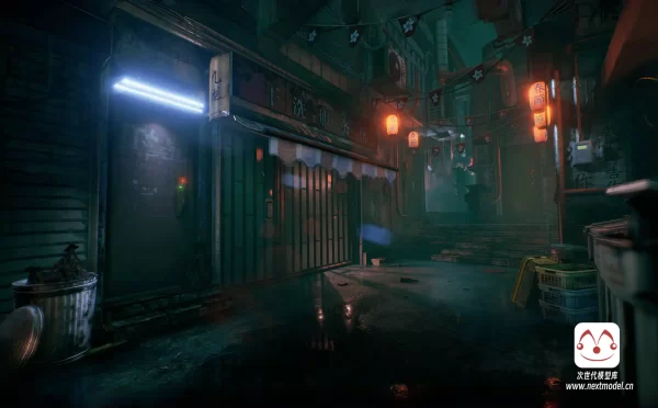 亚洲风香港城市夜景街巷建筑模型