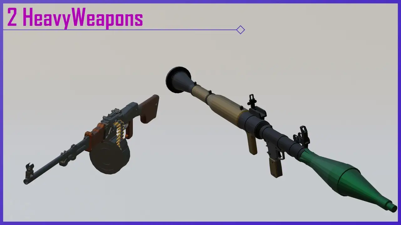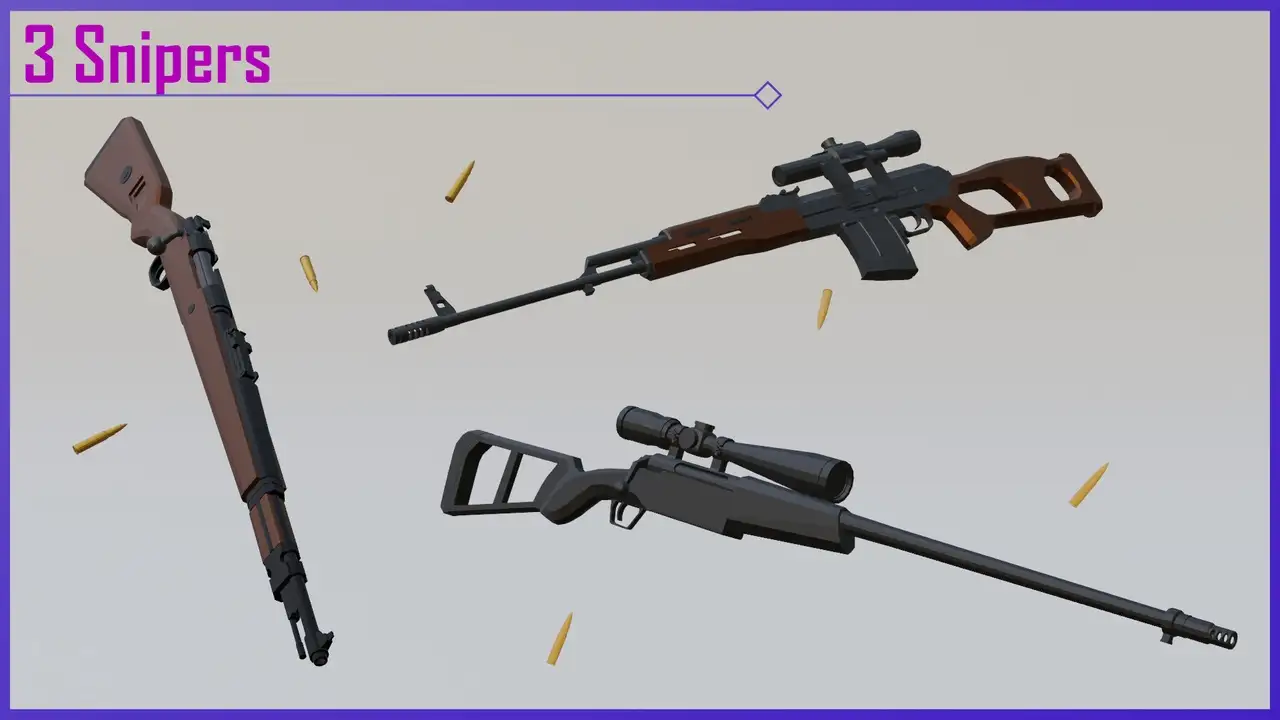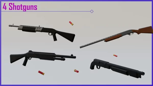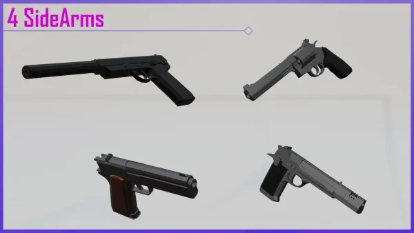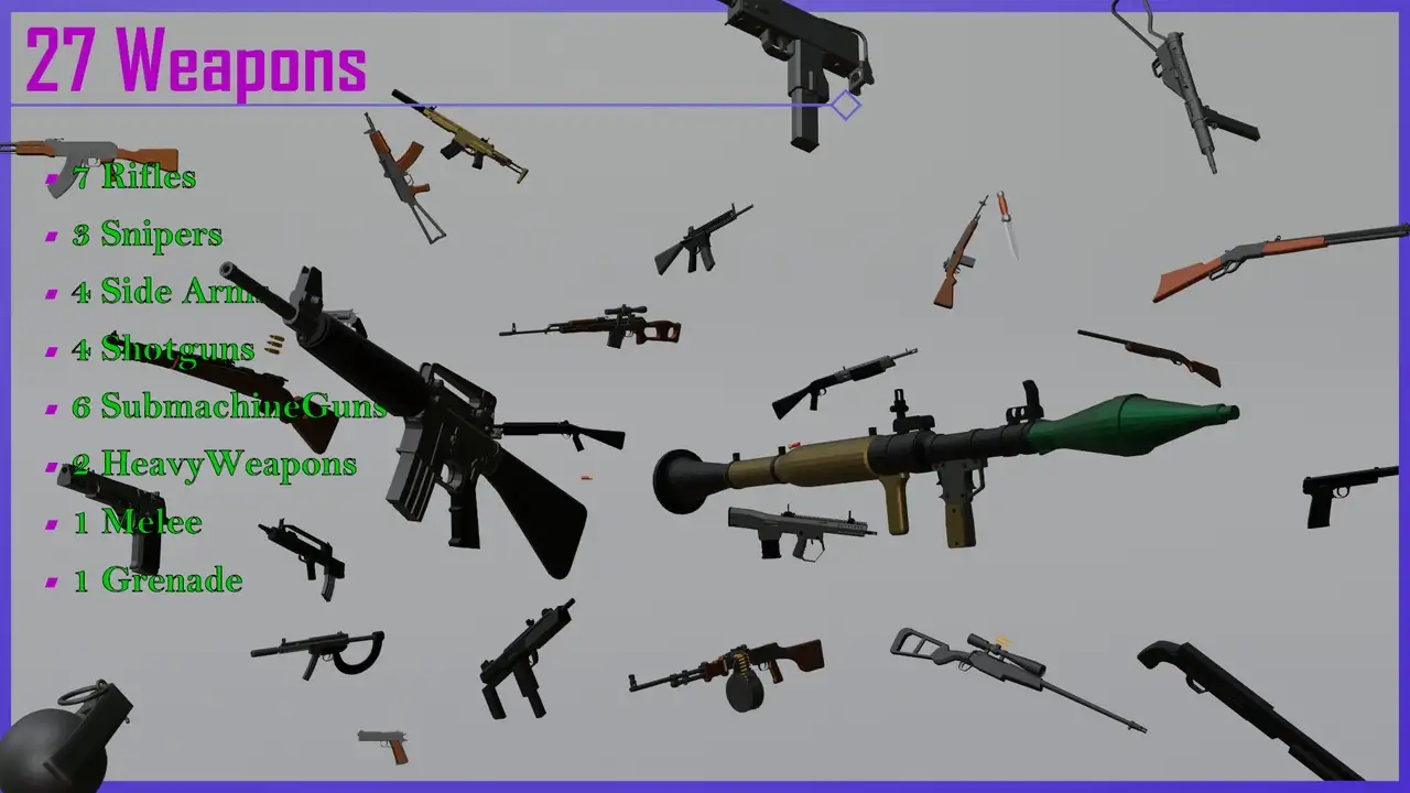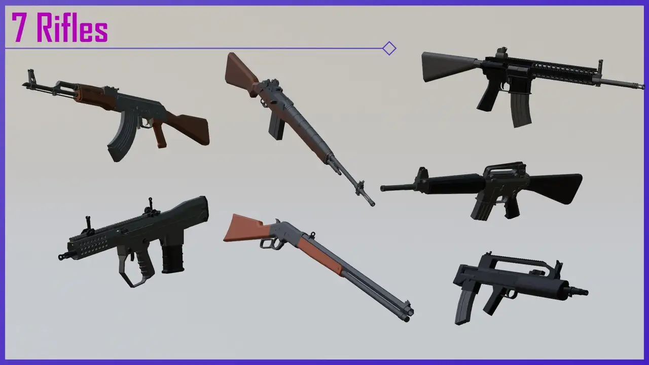 资产包内含28种武器模型,具体分类为:突击步枪7款(含AK-47与M16风格型号)、狙击步枪3款、手枪4款、霰弹枪4款(含温彻斯特风格型号)、冲锋枪6款、重型武器2款、近战武器1款、手雷1款。动画技术参数