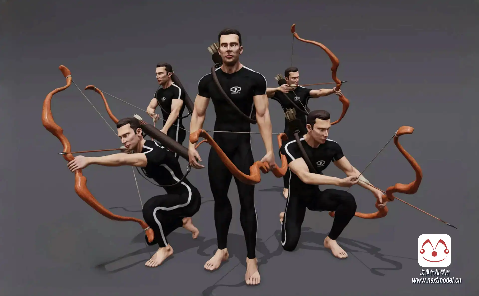 终极动画收藏中包含了一套专为弓箭动画设计的高品质动画集。这套动画集包含了168个人形动作捕捉动画(其中61个为根动作变化),涵盖了站立、持弓(无论是否上弦)、瞄准、行走、奔跑、蹲伏、被击中和死亡等动作。为了确保动画的精确性和适应性,特别是对于双手操作的动画弓,可能需要额外的设置,包括使用IK(逆向动力学)解决方案来确保手部放置的准确性。