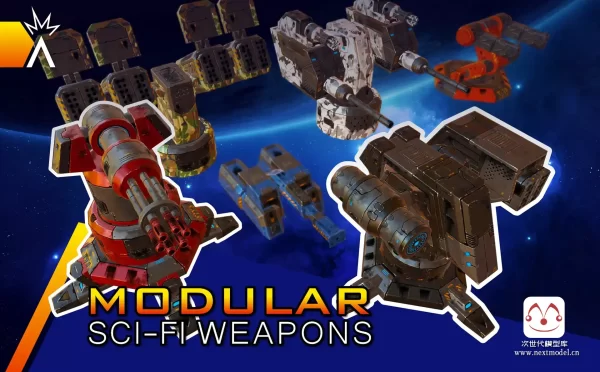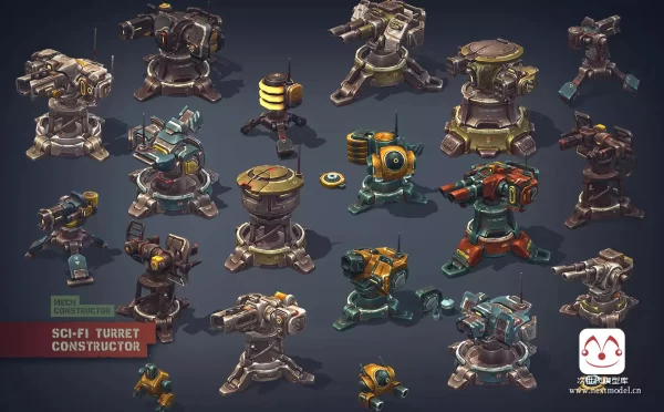 科幻风格塔防游戏模块化炮塔、机甲、机器人模型包