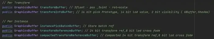 除了缩放和旋转外,还对诸如变换索引选择和LOD交叉淡入值等其他参数进行了打包,进一步提升了内存使用效率。最终的缓冲区及其打包说明如下: