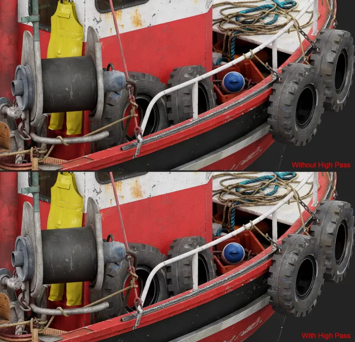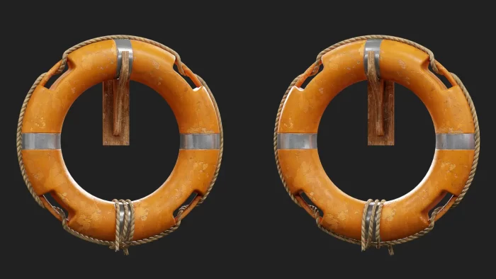 正如这里所示,轮胎因时间和与其他船只碰撞而受损,可以看到许多明显的油漆痕迹,很可能是其他船只船体的油漆。正是这些细微之处让你的道具生动起来。我的目标是通过纹理贴图将轮胎的故事转移到我的道具上。