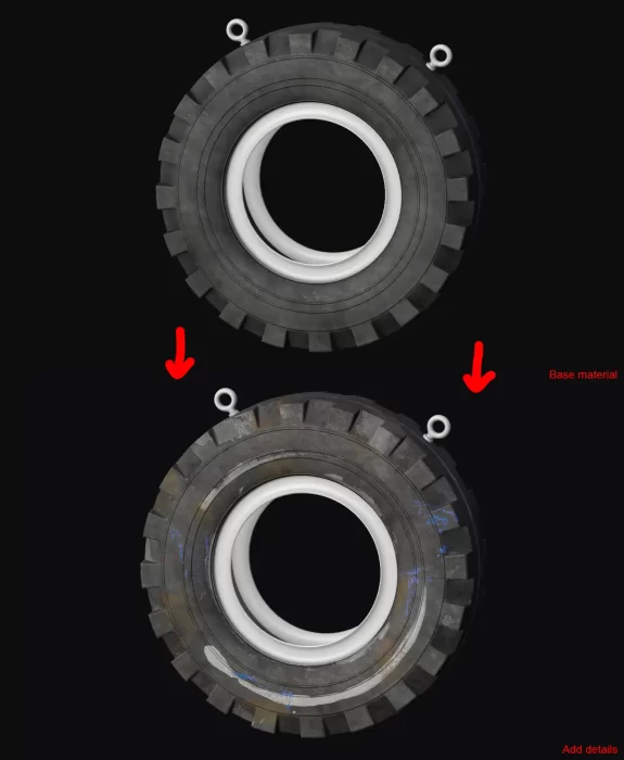 我首先创建轮胎基础材质,即橡胶/胶皮纹理,赋予其颜色和粗糙度特征。然后添加颜色变化,此处偏向白色/灰色,损坏的轮胎往往呈现出这类颜色。接着添加粗糙度变化,轮胎并非完全平整,光线会在内部反射,同时也要考虑到此处的轮胎可能是湿润状态。