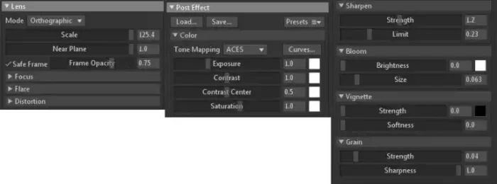 打开Marmoset后的第一件事就是设置场景,对于大部分渲染作品,我倾向于使用正交视场角(orthographic FOV)的相机,我非常喜欢这种渲染效果。务必开启ACES并轻微锐化,避免画面过于模糊,就这样基本完成。对于所有合成工作,我个人更喜欢在Photoshop中进行,这样能给我更多的控制权。