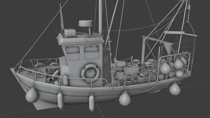 我在现实中找到一艘船作为我的创作对象,这艘船名为STRINKEREZ-DOUR,是一艘来自布雷斯特的老式刺网拖捞船。当我看到这艘船的照片时,立即决定要以其为蓝本进行创作,同时添加一些个人化的元素,比如船舱和船体并不完全一样。