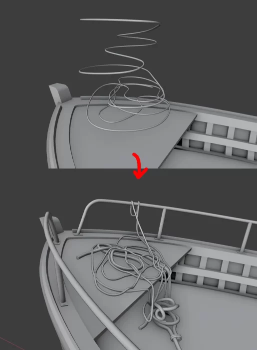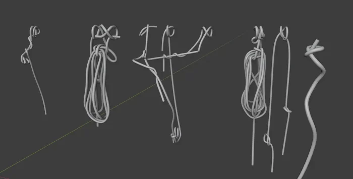 花费时间最长的部分就是创建所有的绳索,我同时运用了Blender的曲线工具和Marvelous Designer的模拟功能。小绳索以及绳结都是使用曲线工具创建的,而堆叠在一起的绳索则是通过Marvelous Designer进行模拟的。