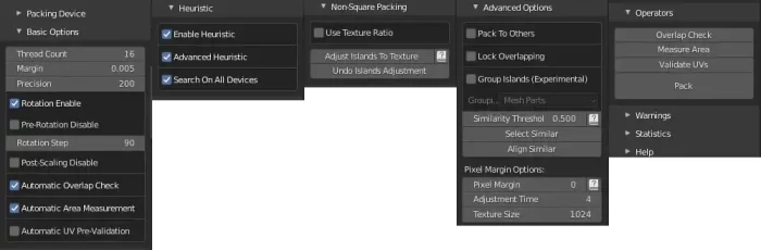 为了帮助完成这项任务,我使用了Blender的两款插件:UV Squares和UV Packmaster,这两款插件节省了我大量的时间。前者可以帮我将UV布局规整为方形,后者则能根据多种选项自动打包UV。