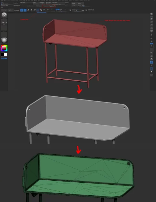 我的工作流程相当简单,将道具导入ZBrush后,我会勾画所有硬边,为此使用ZBrush的“crease edges”功能,可以根据一定角度值进行勾画,缺失的一些勾画我会手动完成。接着只需细分网格并应用Dynamesh,对于这部分,我不需要在高面模型中添加太多细节,因为纹理将会完成剩下的工作。最后进行降面处理并导出至Blender。