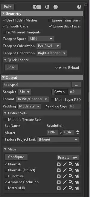 然后只需将它们导入到Marmoset中进行烘焙,我通常选择4K分辨率,仅烘焙法线贴图和环境光遮蔽。