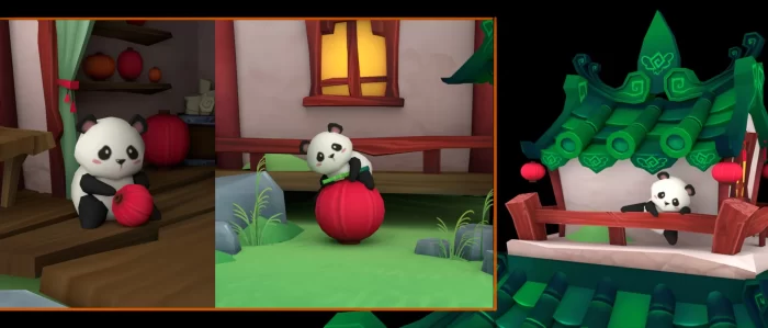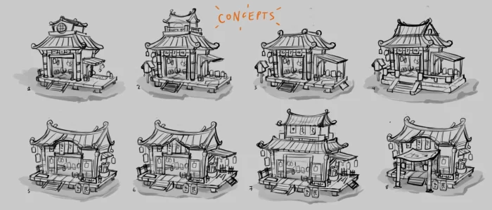该项目的目标是创建一个受中国文化启发的小型风格化手绘微缩景观,同时融入一些真实参考和丰富的想象力(如熊猫入侵元素)。我决定选取灯笼这一标志性元素,想象一家古老小店会是什么样子。建筑及道具需能讲述故事、体现特定文化,并从一开始就具有高度辨识度。在这个项目中,我受到了《阿尔比恩Online》游戏中建筑风格的启发,力求实现同样歪斜、紧凑且扎实的外观。