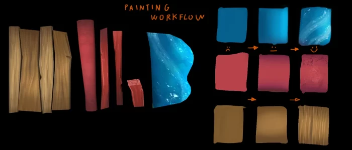 根据所选材质,我开始通过添加纹理质感覆盖渐变的柔和效果。我会使用纹理画笔从先前创建的渐变中取色,然后集中精力模仿所要表现的材质最显著特征。绘制细节时,我始终通过选取已有颜色并调整亮度和色调来选择颜色。色调的变化使模型看起来更具活力。但需要注意的是,过度使用可能导致纹理显得杂乱无章,不够统一。我尽量避免绘制过多细节,尤其是在大型项目中,我们不会对每个对象进行放大观察,此时主要强调边缘高光、描绘光照信息以及在墙壁、木材、岩石等处添加磨损部分。