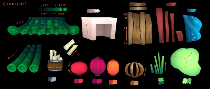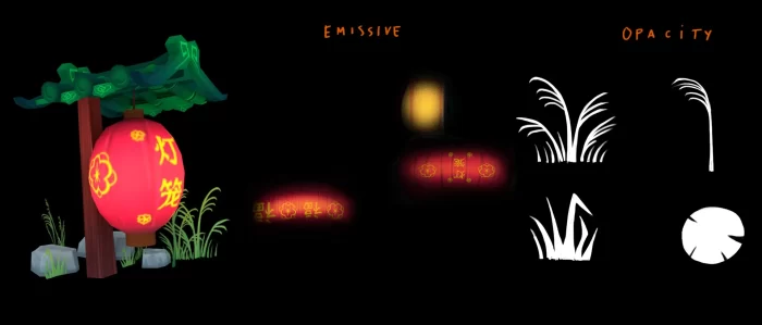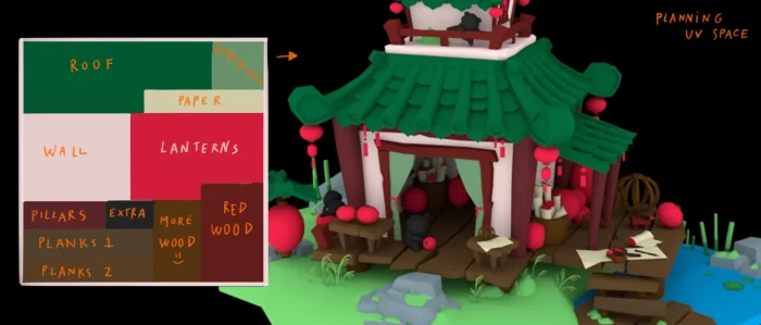 对于道具,我选择了能够清晰传达其功能和特性的元素。我挑选了几件与中国及灯笼店形象紧密相关的简单物品。我还设计了店铺一角,店主在那里用木材、纸张、颜料等材料制作新灯笼。我没有用太多多边形去建模这些道具,更倾向于保持极简外观,只调整和变形少数顶点。如果需要创建细节(如破旧歪斜的木板),我会将这些细节做得很大且明显,但仍保持简洁,不致于在整个网格中四处散落。