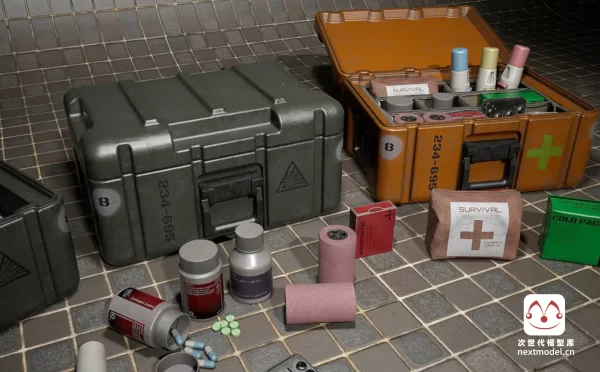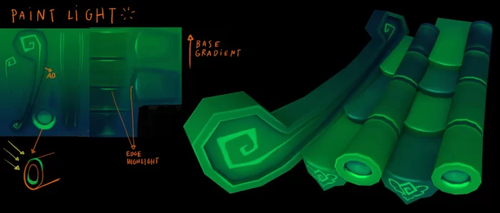 在灯光方面,我也仅使用了几种基础灯光,因为大部分光照效果是由纹理中绘制的明暗区域产生的。我喜欢思考光线可能照射到表面的位置以及阴影可能出现的地方。我会在物体相互交界处绘制一些环境光遮蔽,并将高光赋予那些被(假设的)光源照亮的部分。