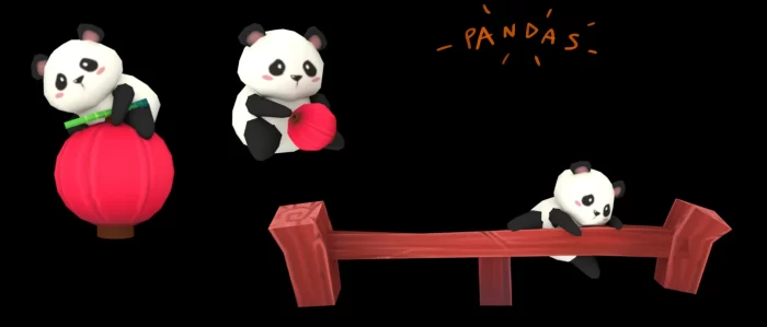 我通过为场景找寻故事来增添其独特性。我认为这样做能赋予所见之物特别的个性和身份,使场景更具吸引力。在这个案例中,店主外出时,熊猫们接管了店铺,拿走灯笼,啃食竹子。我想要一个非常可爱的情景,这也是我选择熊猫的原因。