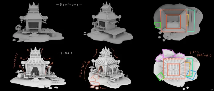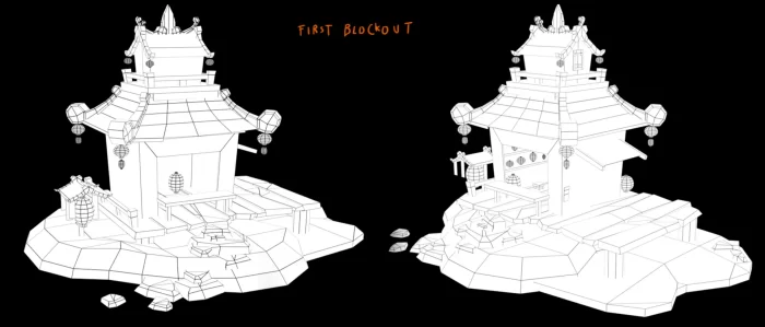 确定最喜欢的构思后,我开始将其转化为3D模型。要让布局草图传达出与原构思相同的感受,这需要时间。因此,我总是从基础形状开始,尽量保持低多边形,主要使用立方体。通过摆放这些形状,有助于确定物体位置,同时我喜欢对其进行一定程度的风格化处理,通过夸大尺寸和方向来增强效果。但有时,当我难以找到合适的形状时,会选择先创建更写实的布局草图,最后再调整所有模型。