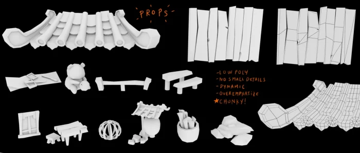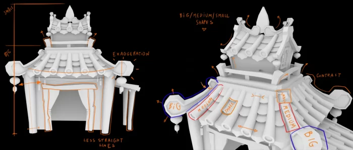 我追求一种歪斜且饱满的风格,所以建筑需要显得厚重稳固,同时又不失可爱。此时,我尽可能避免使用直线和细碎细节。正是这种变形赋予了歪斜与坚实的感觉。我大胆且明显地调整形状,同时为了避免复杂线条,保持整体简洁以提高可读性。特别是在关注由不同部分的方向和交界处产生的对比时,我会寻找一种跟随与打破流动感之间的平衡。对我来说,另一个重要的是大、中、小形状之间的关系。首先,我力求模型中具备不同的比例,然后在构图中平衡它们,以达到良好的视觉均衡。