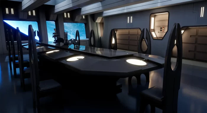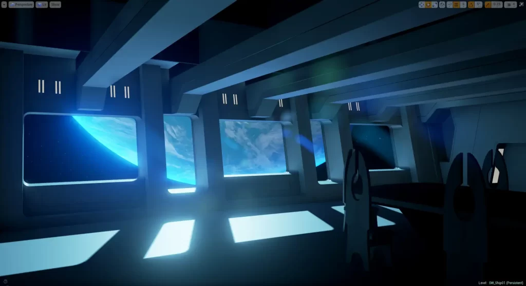 当初步布局完成后,我创建了会议室窗户可见的星空以及行星及其光照效果。灯光与纹理需要同步配合工作,因为如果我们先全力关注其中之一,那么另一个可能需要变得更暗或更亮,颜色也可能与实际所需不符,所以这只是第一遍灯光调整,旨在开始营造该区域的基本氛围。
