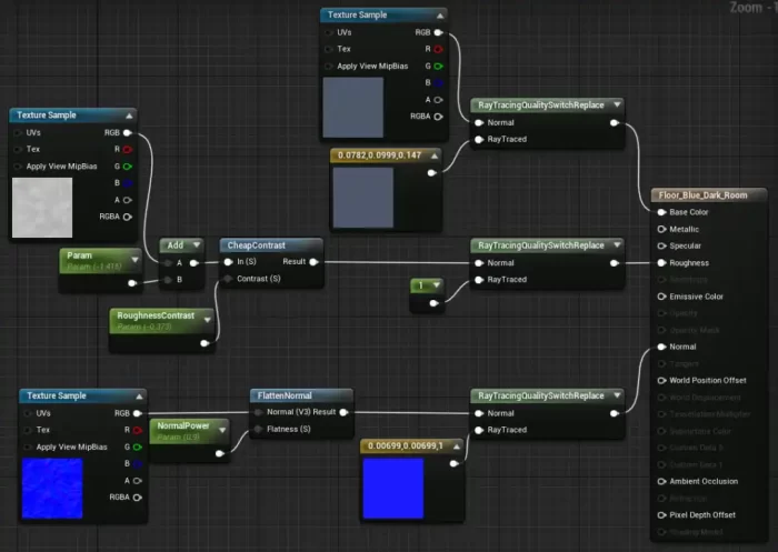 (每种材质都被调整以包含RayTracingQualitySwitchReplace节点,允许有一个较轻量级的版本进行光线追踪)