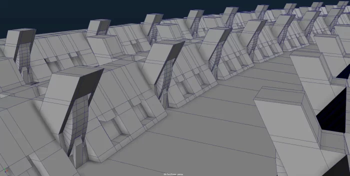 在创建环境的最终模型时,我没有制作任何高精度模型(因此无需烘焙贴图),因为我认为为每个模块都准备大量纹理并不高效——如果想要获得良好的烘焙贴图像素密度,由于模块很大,每个模块都需要很多套纹理贴图——所以我决定使用可平铺纹理,并采用自定义法线技术建模,即倒角和平滑原本硬边的边缘,然后设置顶点法线指向较大的面的方向。这意味着网格面数较高,但却大大减少了游戏中需要加载和实时流送的纹理数量。