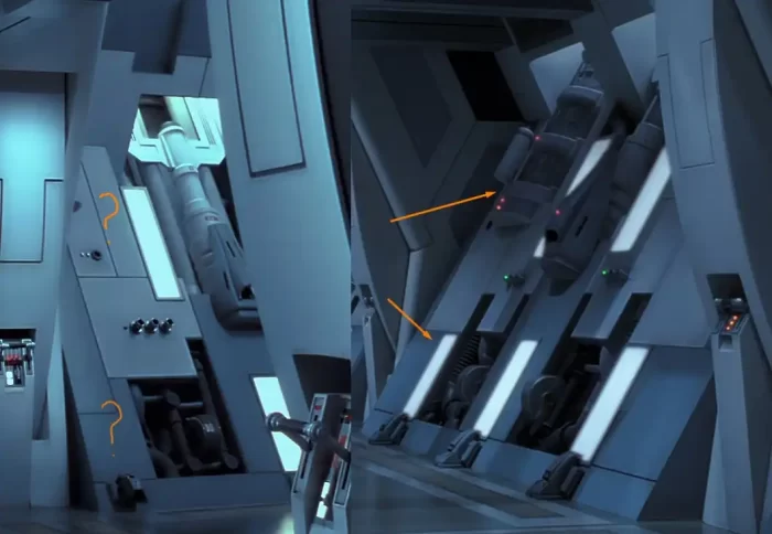 这并不是我环境中唯一没有做得很到位的地方;还有一些地方存在匹配问题,给我带来了不少头疼的挑战。例如,为了实现同心圆状的走廊,外圈的模块必须比内圈的稍大一些。虽然差别很小,但足以导致模块之间出现间隙(或相反,模块相互交叉)。实际上在电影中我们可以注意到至少有两种不同类型的墙体模块: