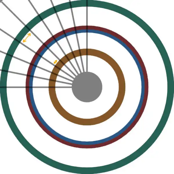 (为了防止墙体间出现间隙或几何体交叉,必须创建四种不同版本的墙体模块——右侧是从上方夸张表示墙壁随着接近圆心而变短的情况)