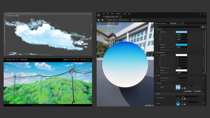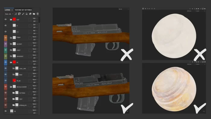 通过基础光照、阴影及背景的调整,我实现了初步效果。在Substance中统一调节所有未来导入UE5的纹理的对比度和HSL预设,有助于节省独特纹理和反射材质的时间。