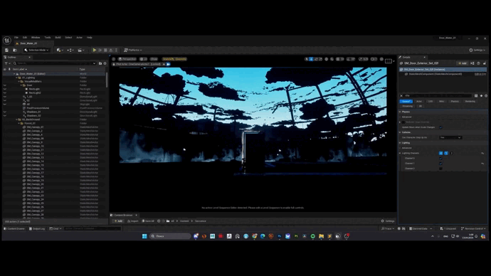 UE5中通过层次系统工作,我发现它比放置点光源更为简便。定向光照将场景分为两半,在右侧形成定向光斑。第二道定向光投射额外阴影,增强物体深度。整体填充光照亮整个场景,天光则用于柔化阴影中的黑色并照亮水面。