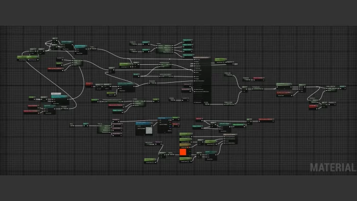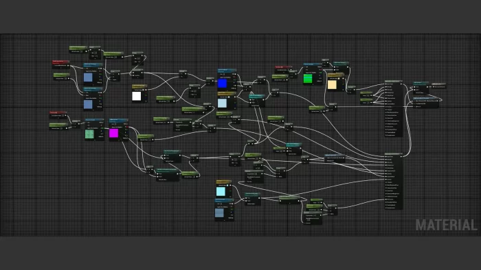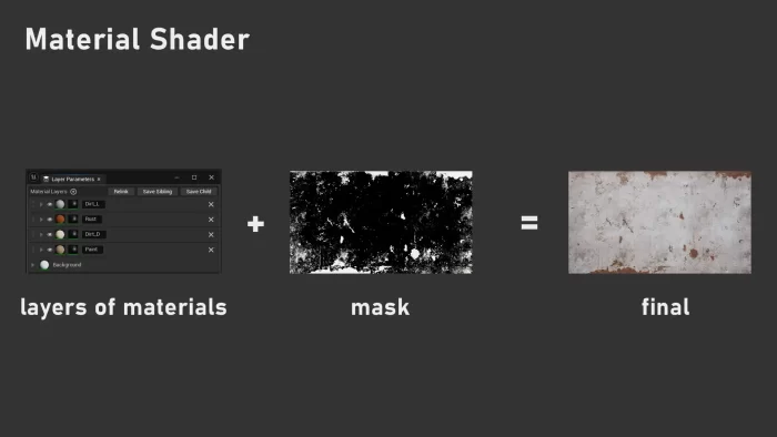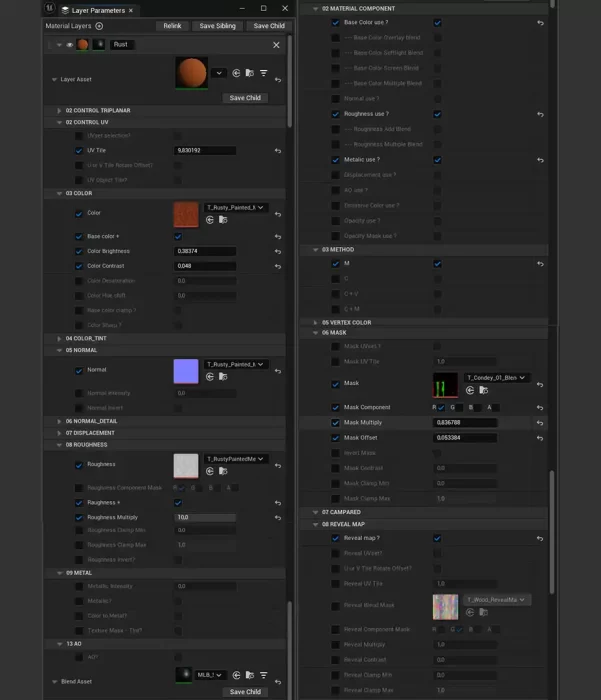 通过Shader的通用材质配置每一层,适用于当前及未来的项目,便于处理平铺纹理、位移以及使用混合、着色、揭示遮罩、顶点颜色和UV集将它们融合。这使我能够重复利用许多相同纹理,实现多样材质。