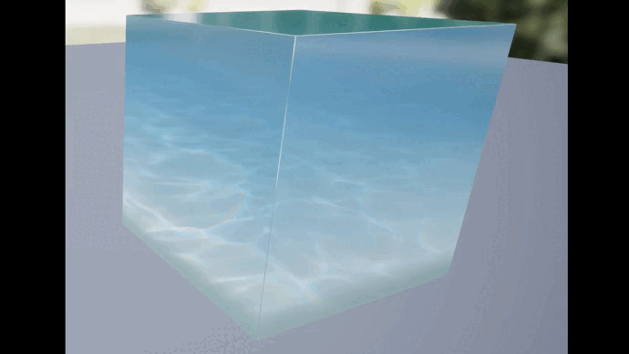 液体中,四层材质在表面不同距离处组合,单独的材质用于处理焦散。概念图显示浅水深度、光线折射产生的渐变和光斑。为表现这些,我必须自制水材质,因为购买的水系统并不符合我的需求。