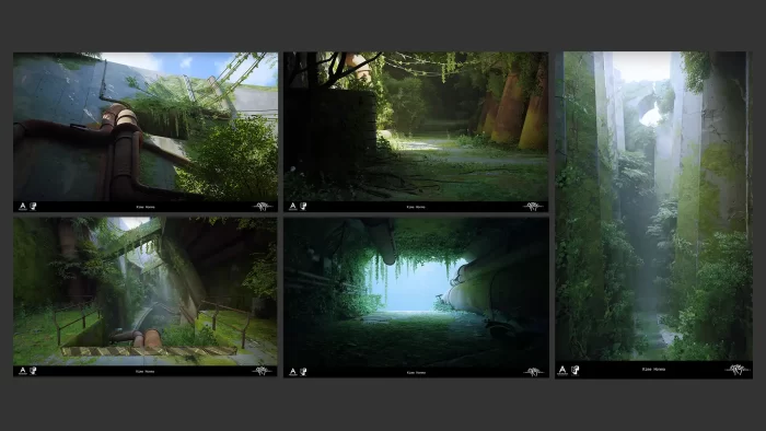确定风格和概念后,我从成功在3D中实现这种风格核心理念的艺术家那里汲取灵感,例如Kima Honma在《Stray》项目中展现的废弃废墟的植被和氛围。