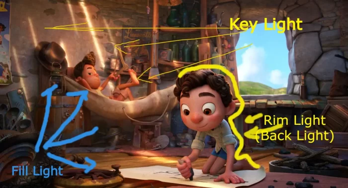 在迪士尼和皮克斯的电影《Luca》中,Luca和阿尔贝托初次相遇后,两个男孩前往位于一座破损塔楼中的阿尔贝托的家,这座塔楼酷似灯塔,内部堆满了杂物。灯光艺术家罗德里戈·德·德乌斯分析了该场景中的照明手法,并对其运用进行了说明。