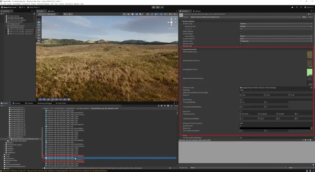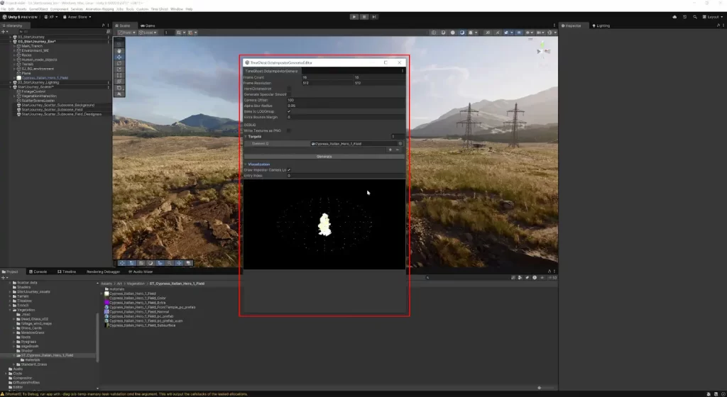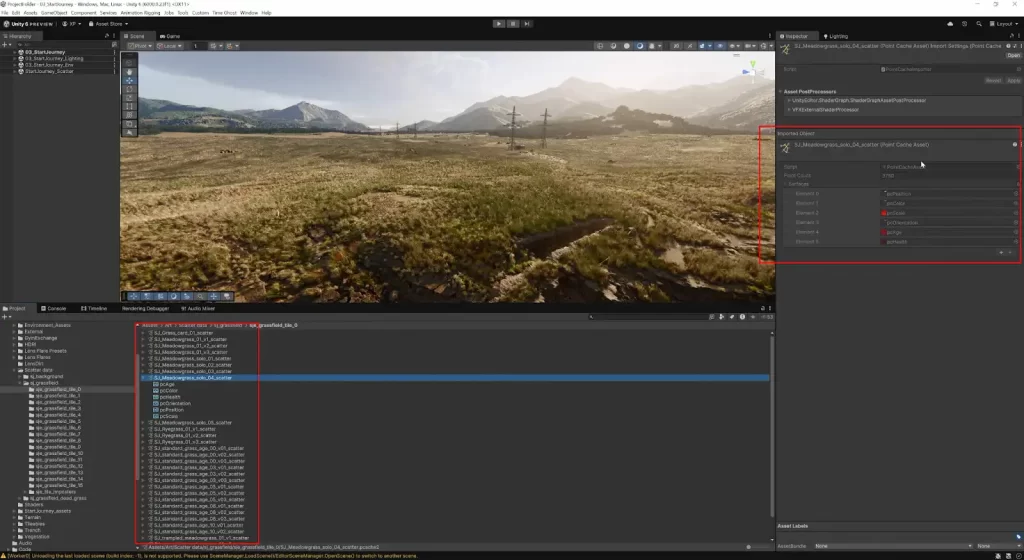 作为第一步,我们将构成环境基础的网格导入到DCC软件中——在本例中是Houdini。这些网格可以是激光雷达扫描、无人机扫描,或是Unity中手动雕刻的地形。对于Houdini,我们开发了散布分析工具,这些工具基于地形属性自动放置资产。这些工具帮助我们设计细节丰富且变化多样的连贯环境。通过使用SpeedTree和标准摄影测量工作流,我们创建了高质量的植被预制件并将它们散布到这些网格上。散布系统允许微调随机性和密度参数,以确保自然的植被分布及其变化。