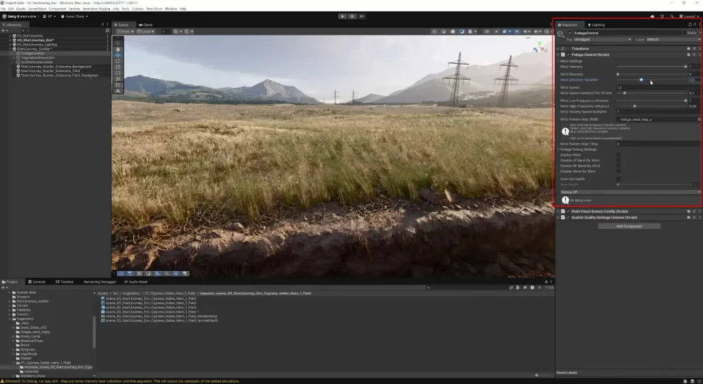 我们的植被控制系统引入了复杂的配置设置,允许我们调整诸如风等环境效果。这包括风速、变化和频率的调整,确保环境中的动画元素既逼真又高效。
