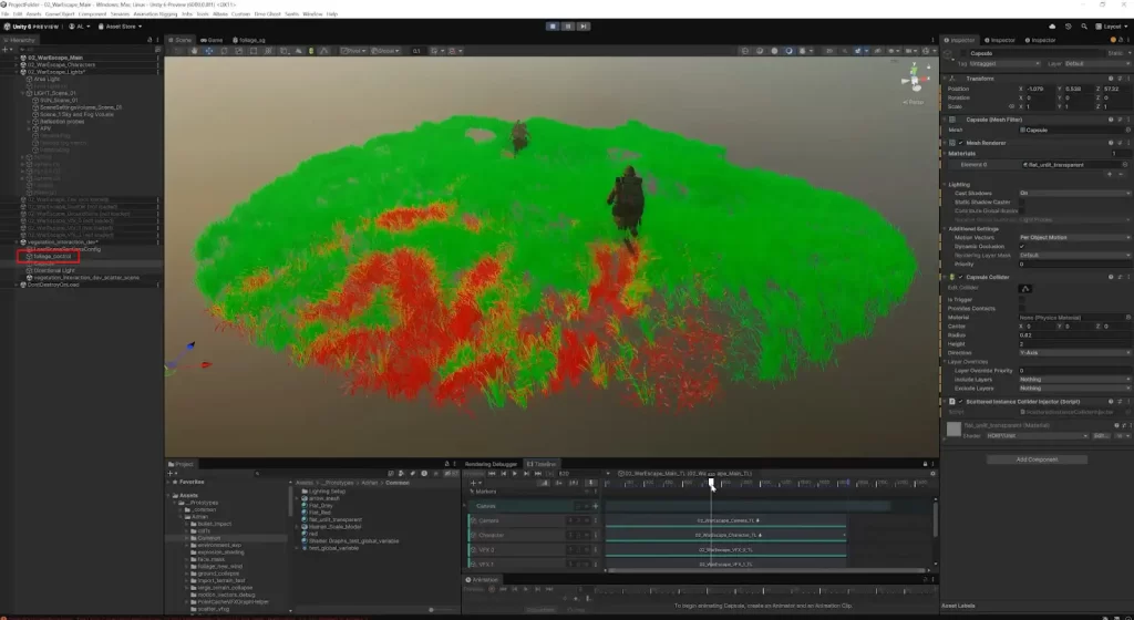 实体被设计成在场景内与角色真实互动。例如,植被会动态响应角色的存在和移动。该系统使用基于GPU的方法来处理与植被的碰撞等交互,并通过简化的弹簧物理计算和模拟角色与环境元素互动的效果。
