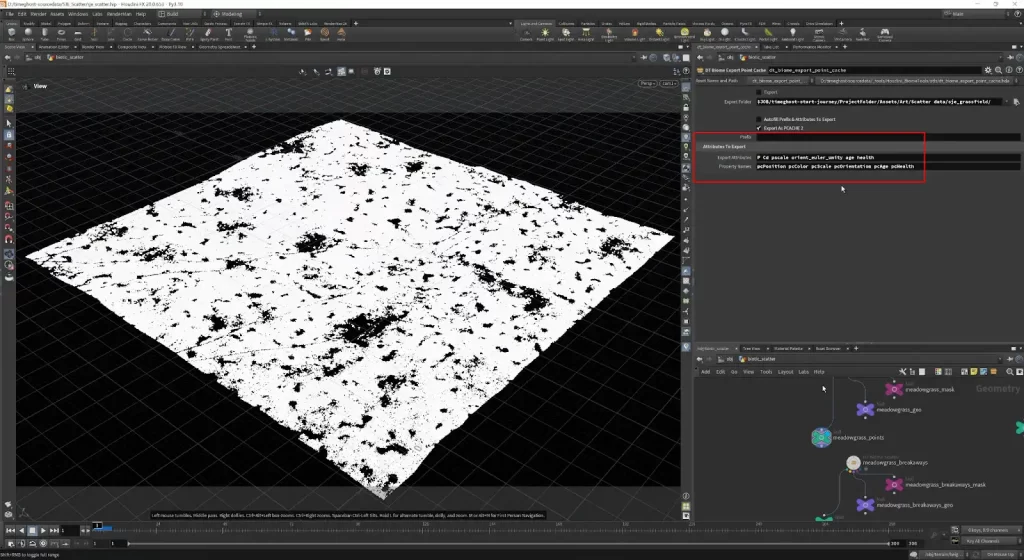 散布数据从Houdini导出为点缓存/点云,使用的是Unity在Github上的VFX Toolbox中提供的Point Cache Exporter HDA的一个稍作修改版本。这个工具的目的是保存每个散布实例的位置,同时也保存缩放、方向、颜色、年龄和健康属性。导出器为每个用于散布的模型生成一个点缓存。