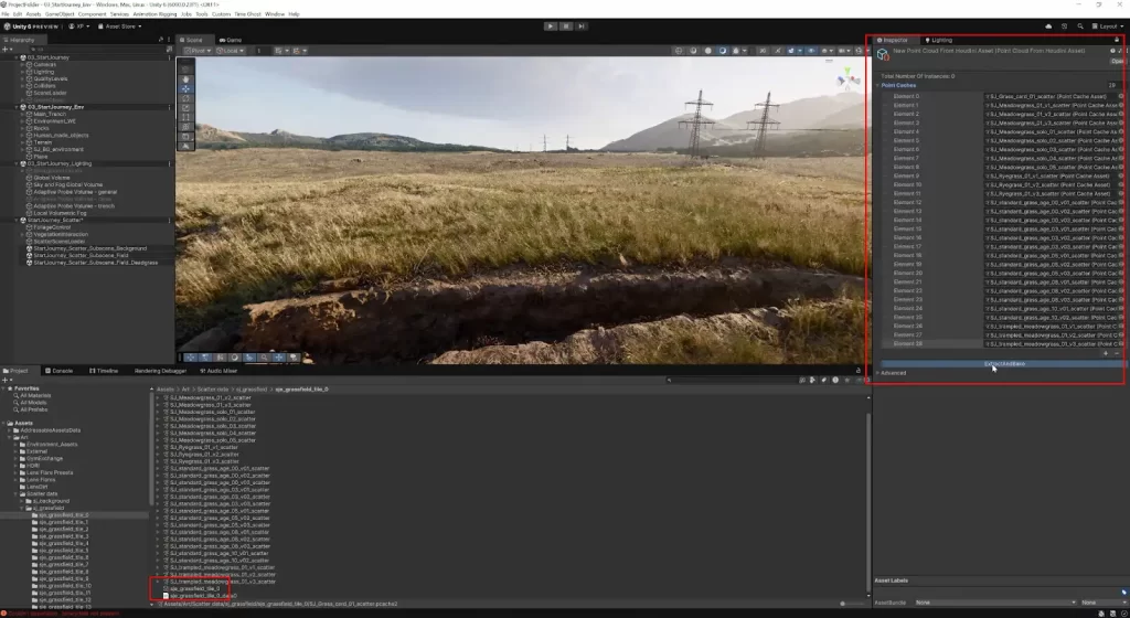 每个由Houdini导出的点云资产实际上只是一系列位置、方向、缩放以及可能的一些额外数据(如年龄、健康、颜色等)。我们将所有Houdini导出的点云收集到一个名为PointCloudFromHoudiniAsset的资源中,该资源读取源点云,根据命名约定找到与给定点云一起使用的预制件,并创建数据的内部表示。这些数据存储在PointCloudFromHoudiniAsset中。然后,烘焙过程利用这些数据将点空间分割成瓦片,以便更快地流式传输。