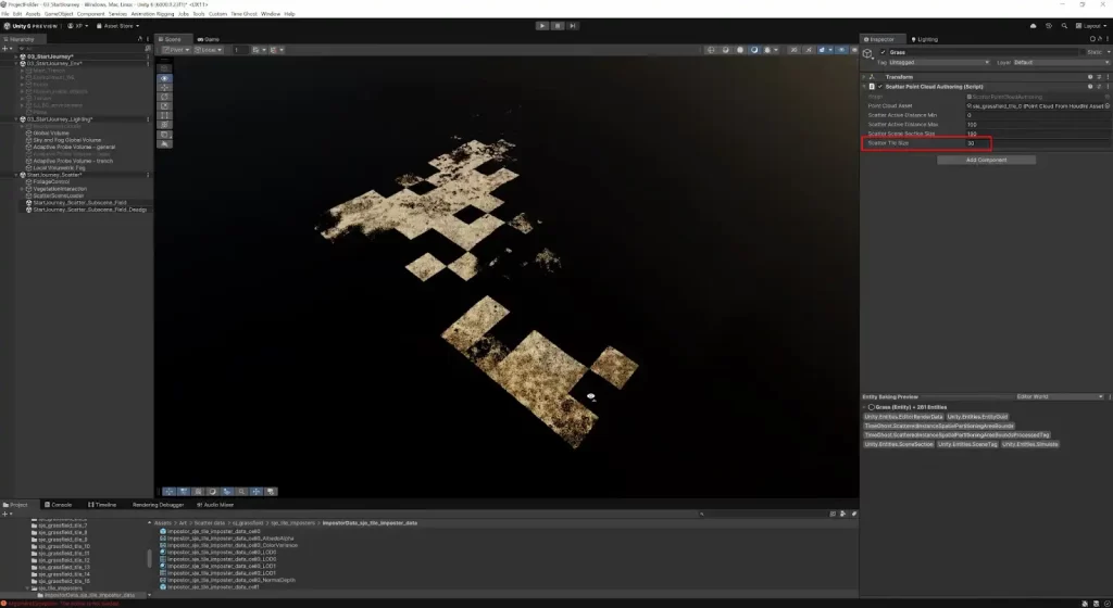 然而,这些场景部分相当大,一次性实例化所有内容会导致CPU出现显著峰值。一个场景部分可能包含数十万个点,因此这些部分进一步细分为更小的瓦片,称为散布瓦片(由创作组件中的ScatterTileSize属性控制),实例化逻辑根据宽松定义的重要性规则选择接下来要实例化哪些散布瓦片以及卸载哪些。