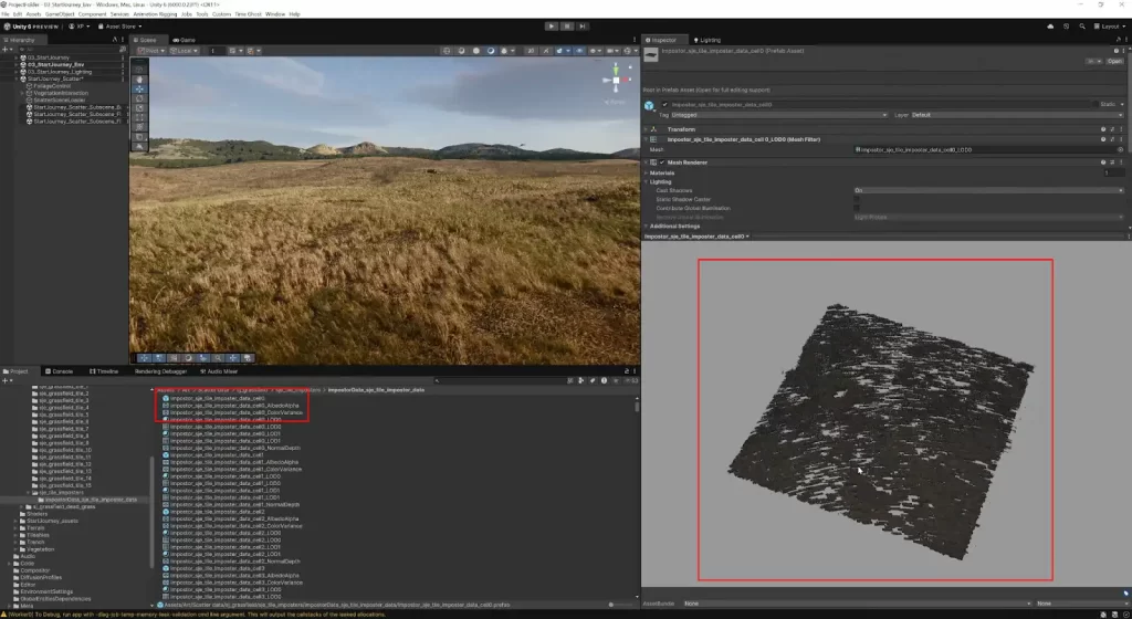 对于场景中非常遥远的对象,我们使用八面体替身。这种方法允许显示远离摄像机对象的简化版本,使我们能够在视觉保真度和性能之间取得平衡。我们创建了一个简单的工具,可以直接在Unity中生成和集成替身,简化了艺术家的工作流程,提供了高效的方法来保持高视觉标准的同时优化性能。