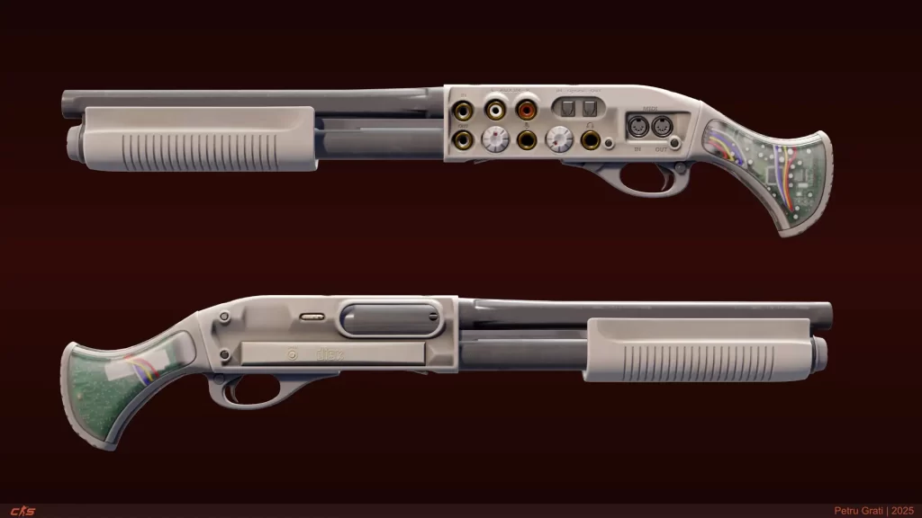 目前,我把大部分时间都花在《Counter-Strike 2 Workshop》的内容创作上。这是一款我热爱的游戏,我也希望未来能有机会参与它的开发。现在,贡献 Workshop 内容是我最接近这一目标的方式。我已经完成了近400个项目,其中79个是原创设计,其余则是颜色变体。我和朋友 EGODEATH 合作设计的一款 Tec-9 Slag 皮肤已经被正式收录进 CS2,成为首批17款官方皮肤之一。而我最新的作品 Sawed-Off Audio 将是我在本次访谈中重点介绍的内容。