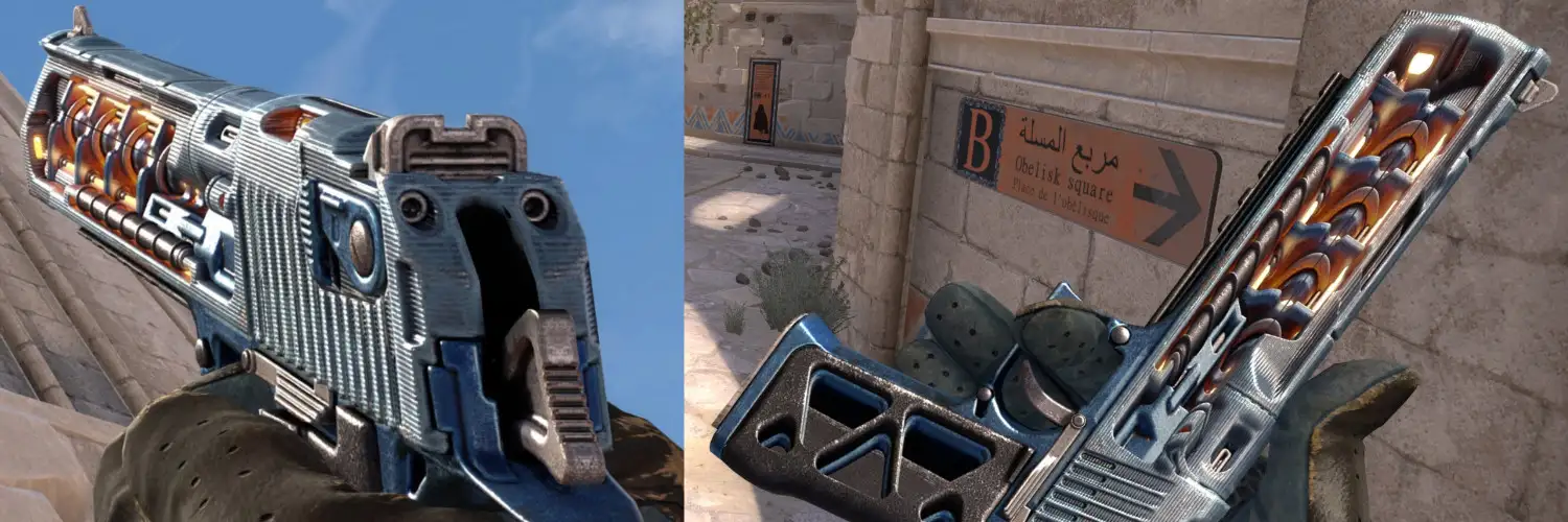几年前,Millenia 曾设计过一款轨道炮风格的手枪皮肤,展示了这种技术的极限。虽然从主要观看角度来看几何感知发生了显著变化,但从正面看时却几乎崩溃。