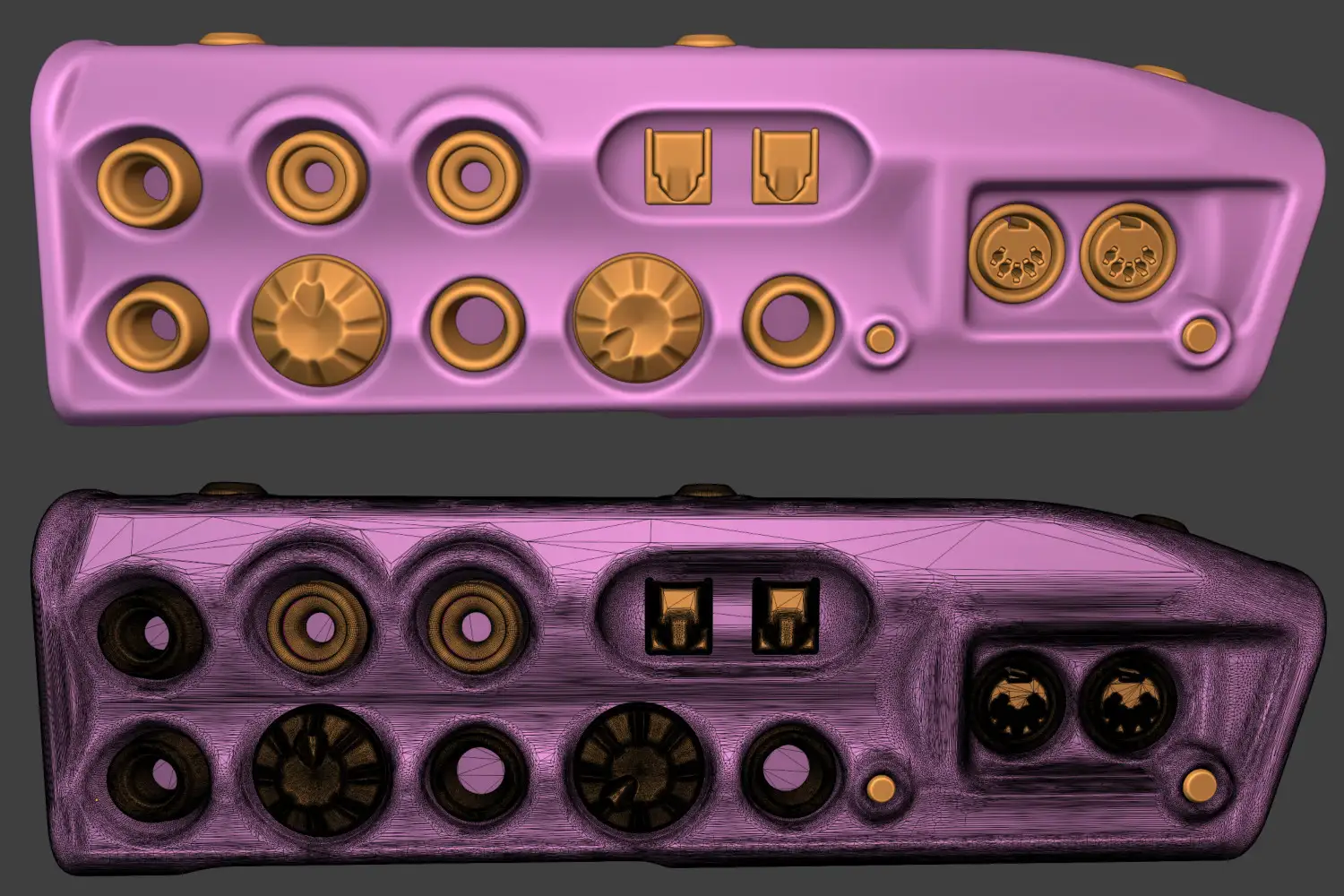 我选择这种建模方式的原因是,多边形建模允许非常精确和细微的调整,使我能够尽可能贴近原始低模的形状。CAD模型的结构基于严格的几何规则,当低模并不完美、存在倾斜优化甚至标准不一致时,很难与之匹配。由于细分建模允许更灵活的形状匹配,因此也能产生最佳的法线贴图烘焙效果。