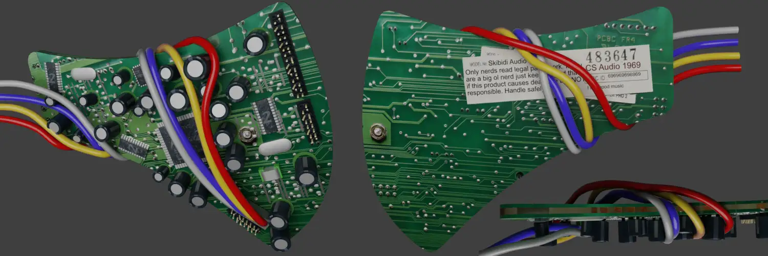 • PCB 使用的是照片贴图,电缆最初也是用的照片贴图,后来我决定为其单独设计材质,并加入 Fresnel 效果以增强曲面在渲染中的可读性。