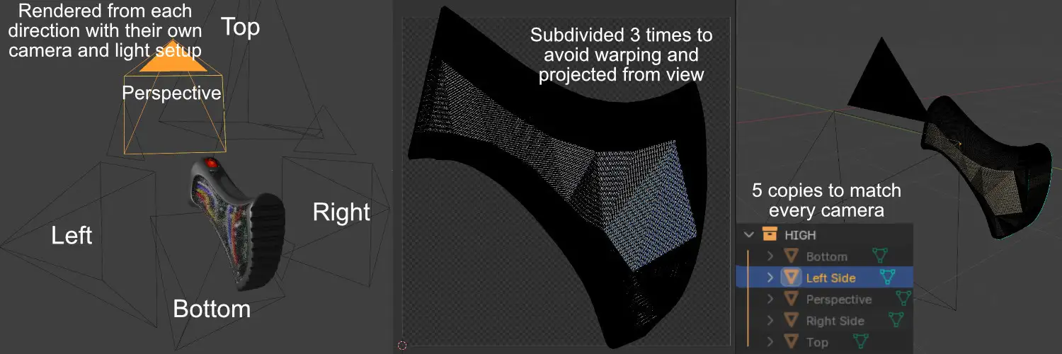 • 每次烘焙都需要一个不同的“假高模”,并且每个模型的 UV 是从对应的相机角度拆分的。