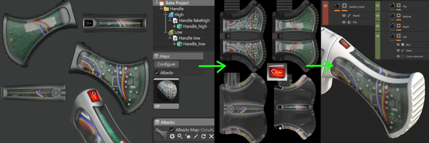 我唯一需要手动拆UV的部分是我想通过透视烘焙捕捉的细节:手柄内部的 PCB 板。纹理绘制则借助了 Ian Hubert 在《Blender 中的世界构建》演讲中提到的写实纹理技术。有趣的是,这其实就是直接使用照片作为纹理,正如他所说:“照片之所以逼真,是因为它们本身就是照片。”这种快速粗略的方法加快了迭代速度,也更容易舍弃那些效果不佳的细节——这些细节如果花费大量精力制作,可能会因为不舍得放弃而保留下来。