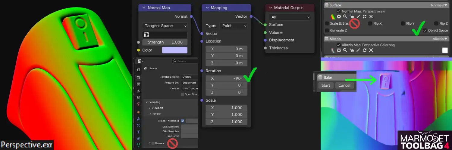 • 对比 Substance 视口中的传统与透视法线贴图,确保颜色与方向一致;
