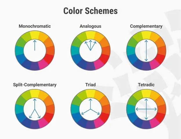 根据这个理论,有一些颜色组合总是搭配得很好,这些颜色可以通过使用特殊的色轮来识别。实际上,有多种组合:互补色位于色轮的对面;对于单色调色板,取一种颜色并在色调上变化;类似色在色轮上依次排列。