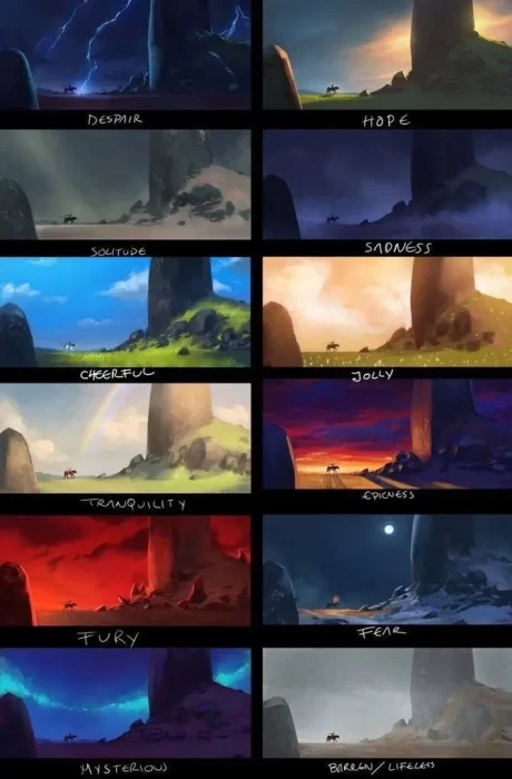 同一场景的几个画面可以完全不同地照明,这在谈论游戏、电影、动画和艺术时都是适用的。在某个时刻,一切都可以是红色和紫色,从而创造紧张和不信任的氛围。在另一个时刻,颜色可能是绿色或蓝色,显示出平静和放松的氛围。